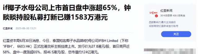 红星新闻 2025-06-30 if椰子水母公司上市首日盘中涨超65%,钟睒睒持股